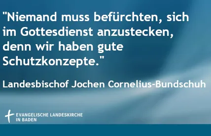„Niemand muss befürchten, sich im Gottesdienst anzustecken, denn wir haben gute Schutzkonzepte: Wir sorgen für die Einhaltung von Hygieneregeln, singen mit Maske und halten Abstand, so dass wir auch Taufen, Trauungen, Konfirmationen und natürlich Beerdigungen durchführen können“ erklärt auch der badische Landesbischof Jochen Cornelius-Bundschuh. „Wir können uns deshalb einen landeskirchenweiten Verzicht auf öffentliche Gottesdienste, wie noch im März, heute nicht mehr vorstellen.“