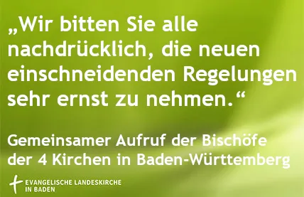 Stuttgart/Karlsruhe/Freiburg/Rottenburg, (03.11.2020). Mit einem gemeinsamen Statement zur aktuellen Pandemie-Lage wenden sich die vier Kirchen in Baden-Württemberg an die Christinnen und Christen im Südwesten.