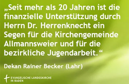 Dekan Rainer Becker (Lahr) äußerte sich sehr erfreut darüber, dass Martin Herrenknecht weiterhin die kirchliche Arbeit vor Ort unterstütze. „Seit mehr als 20 Jahren ist die finanzielle Unterstützung durch Herrn Dr. Herrenknecht ein Segen für die Kirchengemeinde Allmannsweier und für die bezirkliche Jugendarbeit. Gleichzeitig schafft das großzügige Engagement von Herrn Herrnknecht personelle Spielräume, von denen die ganze Region profitiert.“