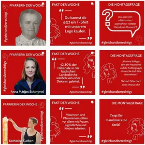 „Montagsfrage“, „Fakt der Woche“ (mittwochs) und Pfarrerinnen-Porträt (freitags) auf https://www.instagram.com/gleichundberechtigt/ sowie https://twitter.com/FrauenIn