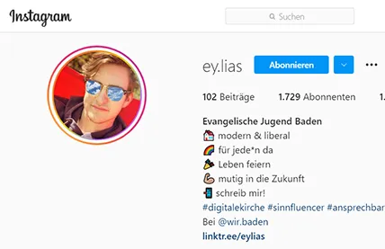 Im Instagram Kanal Ey.lias spricht der Religionspädagogik-Student Elias Renz öffentlich und ganz persönlich über seinen Glauben, sein ehrenamtliches Engagement in der Jugendarbeit und über gesellschaftliche und kirchliche Themen. Über 1.700 Follower hat der Kanal inzwischen, und es werden täglich mehr.