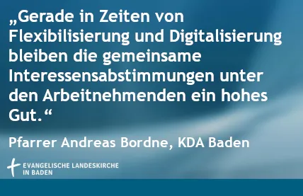 Der KDA Baden betont seine Wertschätzung für die betriebliche Mitbestimmung und die Menschen, welche sich dieser Verantwortung stellen. „Als Mitglieder der Arbeitnehmendenvertretungen üben sie Nächstenliebe in der Arbeitswelt aus“, erläutert Bordne. „Nach evangelischer Sozialethik wahrt die Möglichkeit der Mitbestimmung die Interessen derjenigen, die über kein Kapital verfügen. Die Arbeit der Arbeitnehmendenvertretungen bewahrt die einzelnen Kolleginnen und Kollegen vor Vereinzelung und bündelt die Anliegen zu gemeinsamen Interessen. Im Ausgleich zwischen Arbeitnehmer- und Arbeitgeberinteressen führen sie in vielen erfolgreichen Beispielen zu konstruktiven Dienstvereinbarungen. Gerade in Zeiten von Flexibilisierung und Digitalisierung bleiben die gemeinsame Interessensabstimmungen unter den Arbeitnehmenden ein hohes Gut.“