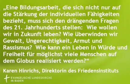 Die globalen Konflikte und Kriege haben Auswirkungen auf alle Ebenen des Zusammenlebens und machen gerade jungen Menschen Angst. Sie sehen ihre Zukunft bedroht durch die Klimakrise und sie machen sich Gedanken, was gegen Kriege um Ressourcen getan werden kann. Eine Bildungsarbeit, die sich nicht nur auf die Stärkung der individuellen Fähigkeiten bezieht, muss sich den drängenden Fragen des 21. Jahrhunderts stellen: Wie wollen wir in Zukunft leben? Wie überwinden wir Gewalt, Ungerechtigkeit, Armut und Rassismus? Wie kann ein Leben in Würde und Freiheit für möglichst viele Menschen auf dem Globus realisiert werden? Friedenspädagogische Bildungsprozesse können von der zwischenmenschlichen über die lokale bis zur internationalen Ebene einen kleinen Beitrag leisten, damit die Chancen auf ein friedliches Aushandeln von Konflikten erkannt und genutzt werden.