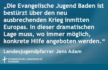 Karlsruhe, (25.02.2022). Die Evangelische Jugend in Baden hat ihre Mitglieder dazu aufgerufen Unterbringungsmöglichkeiten und weitere Hilfen für Flüchtlinge aus der Ukraine anzubieten. „Die Evangelische Jugend Baden ist bestürzt über den neu ausbrechenden Krieg inmitten Europas. In dieser dramatischen Lage muss, wo immer möglich, konkrete Hilfe angeboten werden“, erklärte Landesjugendpfarrer Jens Adam (Karlsruhe).