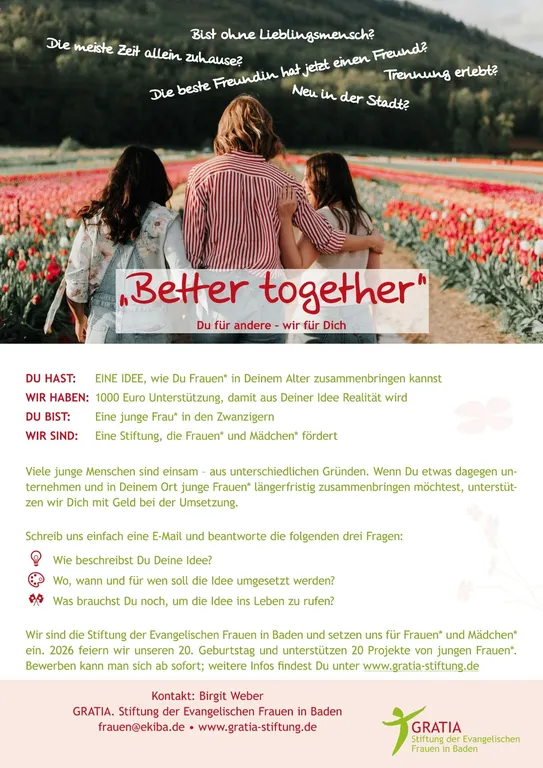 GRATIA, die Stiftung der Evangelischen Frauen in Baden, fördert mit dem Programm „better together“ im Zeitraum von September 2025 bis September 2026 bis zu 20 Initiativen junger Frauen* gegen Einsamkeit. Das Programm „better together“ verfolgt das Ziel, die individuelle Situation junger Frauen*, die von Einsamkeit betroffen sind, sowohl akut als auch nachhaltig zu verbessern.