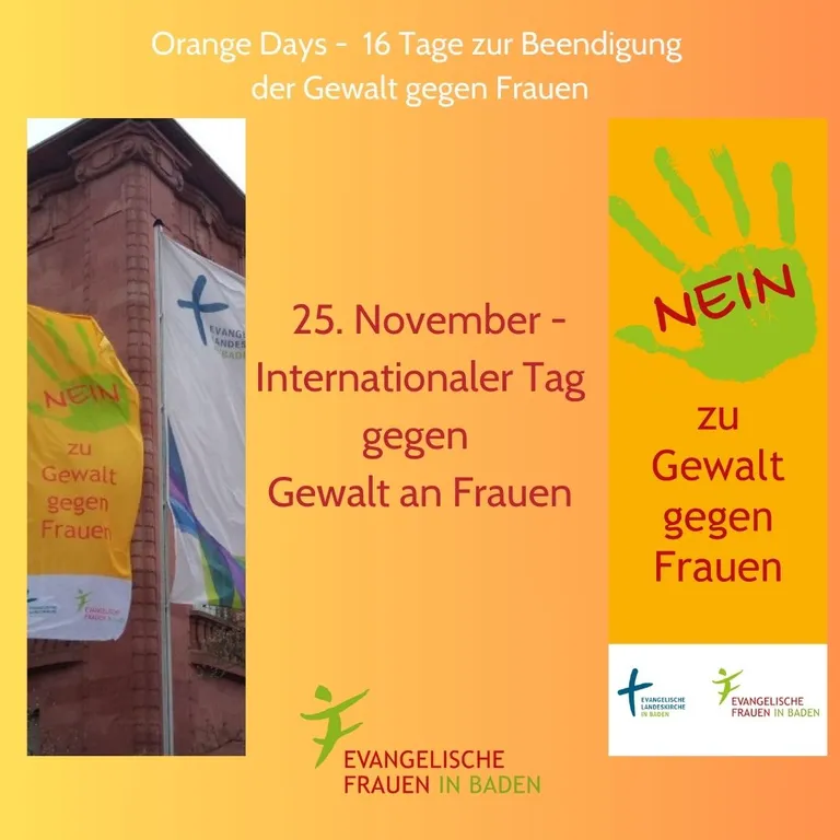 Zum Internationalen Tag gegen Gewalt an Frauen wehte auch in diesem Jahr als weithin sichtbares Zeichen die leuchtend orangene Fahne „Nein zu Gewalt gegen Frauen“ am Gebäude des Evangelischen Oberkirchenrats in Karlsruhe. Seit 1981 organisieren Frauen- und Menschenrechtsorganisationen weltweit Veranstaltungen und Aktionen an dem Gedenktag zur Bekämpfung Gewalt jeder Form gegenüber Frauen und Mädchen.