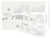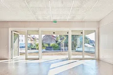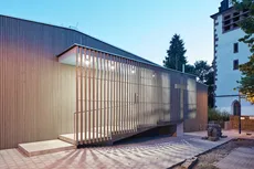 Auf der Südseite ist das Gebäude zweigeschossig und ermöglicht einen direkten Bezug ins Grüne. Raumhohe Fenster im Erdgeschoss gewähren den direkten Zugang in den Garten. Die großen Saalfenster und der Gemeindeplatz im Obergeschoss bieten eine herrliche, neu gewonnene Aussicht ins Tal.