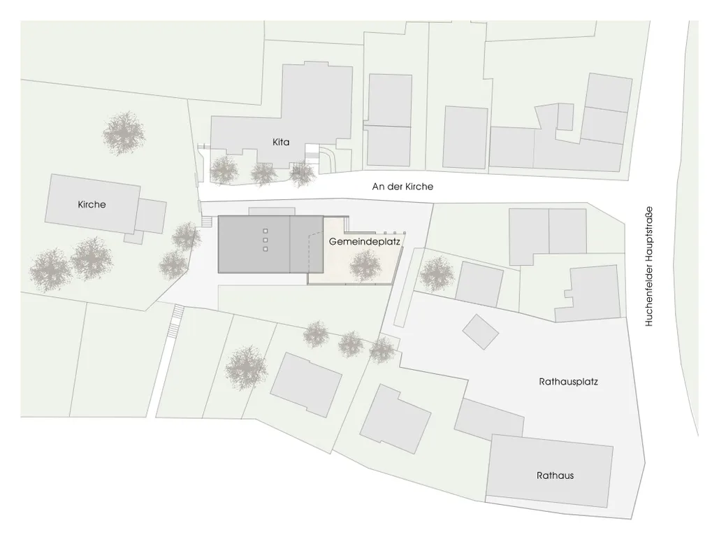 Den Turm der Huchenfelder Kirche immer im Blick – erleben die Besucher*innen beim Annähern die bewusst inszenierte Wechselwirkung zwischen Gemeindehaus und Kirche. Das in die äußere Holzschalung dezent eingearbeitete Kreuz signalisiert die inhaltliche Bedeutung des Neubaus als christliches Gemeindehaus.