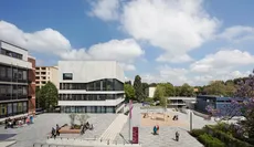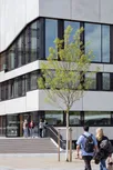 Rampen, Treppen, Sitzinseln und die zentrale Mitte unter neu gepflanzten Bäumen schaffen vielfältige Aufenthaltsmöglichkeiten für Studierende, Kinder und die Nachbarschaft in einem lebenswerten Stadtteil.