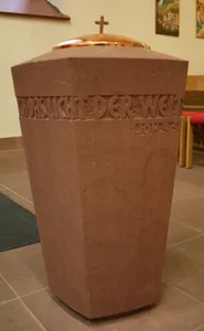 Der Taufstein am Fuß rechts vor dem Altarraum ist das Meisterstück des Hagsfelder Steinmetzmeisters Peter Küchlin, das dieser 1962 der Gemeinde zum Geschenk gemacht hat. Der rote Sandstein trägt auf seinen fünf konkaven Seiten die Inschrift »Dieweil ich bin in der Welt, bin ich das Licht der Welt.« (Joh. 9,5). Die einliegende Silbertaufschale mit Kupferdeckel stammt von der Oettinger Firma H. Fischer.