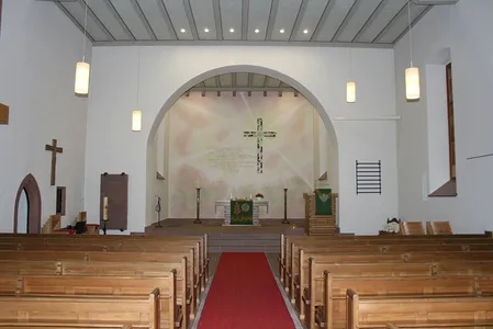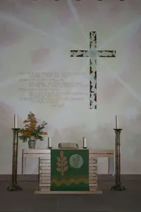 Der Altarrückraum samt Glaskreuz gestaltete der Brettener Maler und Künstler Karlheinz Fritz. Ins Auge fällt zunächst das leicht versetzt angebrachte Farbkreuz. Die hinter dem Kreuz »durchscheinende« Sonne symbolisiert mit ihren Strahlen die Auferstehung, die durch alles Leiden hindurch scheint. Auf dem Kreuz sind rote und grüne »Scherben« angebracht, Zeichen für das, was sich in einem Menschenleben an Scheitern und Schuld ansammeln kann und für das Christus gestorben ist. Die Farbe rot steht für die Liebe, aber auch für den Schmerz. Das Grün symbolisiert die Hoffnung und die Verheißung, zwischen den „Scherben“ wird ein Weg sichtbar, der ins Zentrum des Kreuzes, ins Licht führt. Im Stile eines Aquarells ist auf der Altarraum-Rückwand die Aussage des 121. Psalms dargestellt: Im unteren Bereich die Berge, vom Kreuz her die Hilfe. In bewusst zurückhaltender Schrift sind die Worte des Psalms an zentraler Stelle neben dem Kreuz geschrieben. Fritz will die Betrachter immer wieder aufs Neue herausfordern, die Worte für sich neu zu entdecken.