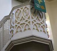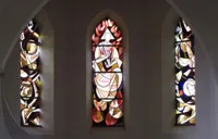 1956 wurden in die Fensteröffnungen über dem Altar drei Buntfenster des Künstlers Christof Grüger eingebaut. Für die dargestellten Szenen aus Offenb. 4 verwendete Grüger Töne aus der rötlich-braunen und beigen Farbpalette, was harmonisch gut mit der beige-weißen Bemalung des Kircheninneren harmoniert sowie mit dem umlaufenden floralen Fries, das in seiner Form ein wenig an antike Palmettenmotive erinnert.
