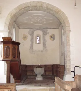 Der Kirchenraum besticht durch seine wohlproportionierten Maße. Der Gemeinderaum wird heute von einer 1953 eingezogenen Holzdecke abgeschlossen, der Boden wurde im gleichen Jahr mit rötlichen Tonplatten ausgelegt. Den Chorraum trennt ein rundbogiger Triumphbogen vom Kirchenschiff. Der Altarraum ist sehr schlicht gestaltet. Einen künstlerischen Akzent setzt das Ostfenster, das 1977 durch den Glasmaler Gian Casty gestaltet wurde. Die Mitte des Chorraumes wird von einem einfachen, 1953 stark überarbeiteten Taufstein beherrscht.