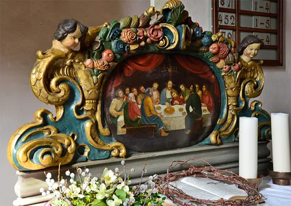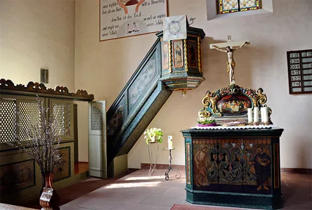 Eine Besonderheit ist der hölzerne Schrankaltar mit der symbolischen Abbildung von Taufe (Johannes der Täufer), Abendmahl (Paulus mit dem Kelch) und dem Wort Gottes (Jesus Christus). Die seitlichen Gemeinde- und Kirchenratsbänke stammen ebenfalls noch aus früher Zeit.