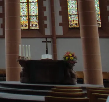 Das Glasfenster über der Westempore stammt vom berühmten von Gottfried von Stockhausen aus dem Jahr 1965 und zeigt das Lamm auf dem Buch mit dem sieben Siegeln aus der Offenbarung des Johannes. Seine volle Pracht entfaltet es nur in der Abendsonne.
