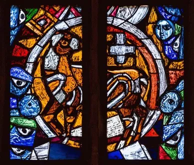 Die Bedrohung des modernen Menschen wird auf diesem Fenster dargestellt, gespalten in seinem Leben wie die Kreuze am Ende des Textes.