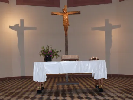 1964 wurde durch Spenden der Gemeinde ein holzgeschnitzter Christus für das schlichte Holzkreuz hinter dem Altar erworben. Es ist eine spätromanische Arbeit aus dem oberrheinischen Raum, die vermutlich aus der abgerissenen Abteikirche von Murbach im Elsass stammt. Mit weit ausgebreiteten Armen und einem äußerst eindrucksvollen Gesicht zeigt der Korpus eine eigenwillige Künstlerhand.