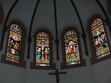 Seit der Fertigstellung der evangelischen Kirche von Badenweiler befinden sich im nach Osten ausgerichteten Chorraum vier Farbfenster, die schon während der Bauzeit des Gebäudes 1896 von verschiedenen Menschen gestiftet und von der Firma Beiler aus Heidelberg angefertigt worden sind. Die Viereraufteilung ist ungewöhnlich. Mit Motiven aus dem Leben von Jesus sind sie ‚durchkomponiert‘ und zeigen oben jeweils das himmlische oder das irdische Jerusalem und unten die weltlichen Grundlagen, in die das Evangelium eingebettet ist. Von links nach rechts sehen wir: